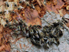 | ニホンミツバチ 2010.8.29 武尊山・玉原(古見満雄氏撮影) 上のトチノキの巣をクマに襲撃されて、途方に暮れるニホンミツバチ。オオスズメバチにも襲撃されるので何だか気の毒。 |
