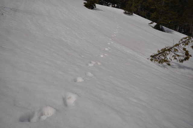 | 鳩待山荘を6時に出発し、小笠・笠ヶ岳と通過して坤六峠に到着したのが昼過ぎ。前日にアヤメ平・尾瀬ヶ原と遊び歩いたのがいけなかったのか、既に体力の限界が近づいていました。ここからまた西山まで登りかと考えるとウンザリでしたが、何度も休憩しつつ登り続ける。ようやく西栗沢源頭部稜線に到着すると、西面は雪が溶けて一部笹藪が露出していました。スノーシュウを外すのも面倒なので獣道が付いている辺りをスノーシュウで歩いていると、足下にポッカリ空いている穴が視界に一瞬入りました。急斜面だしネズコの大木もたくさんある。あやしい稜線だと思いつつ中を見たいという興味が湧き、180°向きを変えもう一度穴の方に戻り中を覗いてみました。「クゥー、キュー」えっ?何?「グゥオ〜〜!」親子グマの越冬穴かい…。やっちまった!再び180°向きを変えようとしましたが、スノーシュウは反転が苦手。しかも笹の急斜面。よろめきながらクマよけスプレーを出そうとするも両手にストックを持ちグローブをしていてスプレーが取り出せない。「なんちゅうこっちゃ、何のためにぶら下げているんだ…」逃げなければと前に進みましたが笹に引っかかりズッコケ転倒。穴からの距離は5mほどしかなかったため、かなり動揺し立ち上がれない。もう終わりか…。半分諦めながらも何とか笹に絡まるスノーシュウを引っ張り出し立ち上がる。再度穴のある方を振り返るとクマは出てきていない様子。夕方で子グマが外に出ると体温が下がるため、母グマが出るのを躊躇したのかもしれない。助かった。 |